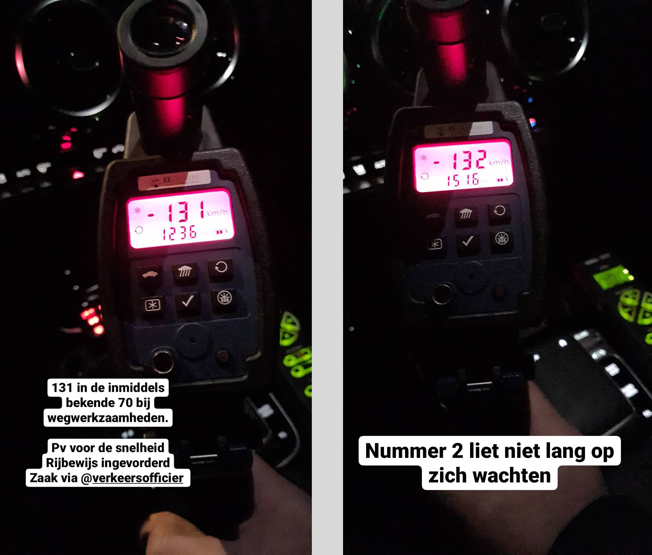 Kort voor acht uur reed een automobilist 131 gecorrigeerde kilometers per uur. Eén proces verbaal en een ingevorderd rijbewijs later schoten de agenten vrijwel direct weer raak. ‘Nummer twee’ reed met 132 km/u langs de werkzaamheden.