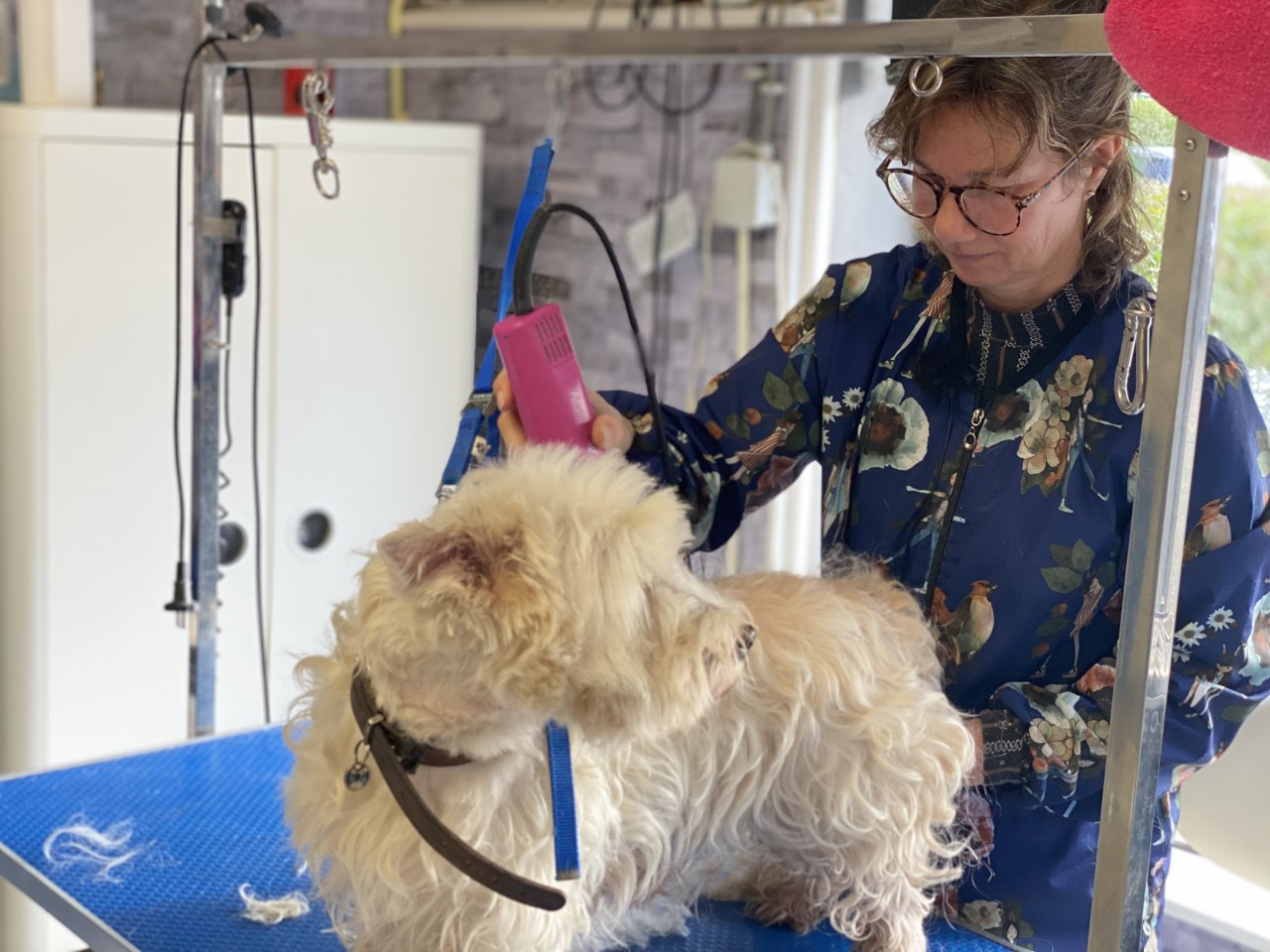 Happy Dog knipt zo’n zes honden per dag: ‘Je bent zo’n twee uur met een hondje bezig. We kunnen ook niet al te veel doen want een hondje moet ook rustig blijven en je moet zelf ook rustig zijn. Anders wordt het echt één grote chaos!’. Voor elke hond wordt ruim de tijd genomen.
