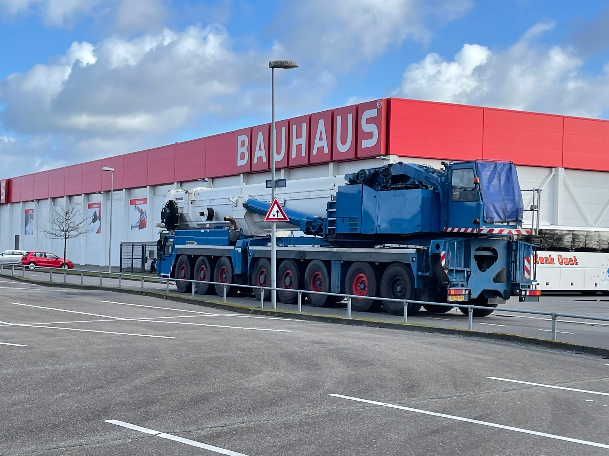 De telescoopkraan die dinsdag achter het woonwarenhuis Ikea omviel is donderdag overeind gezet. Het gevaarte kon daarna op eigen kracht weer rijden.