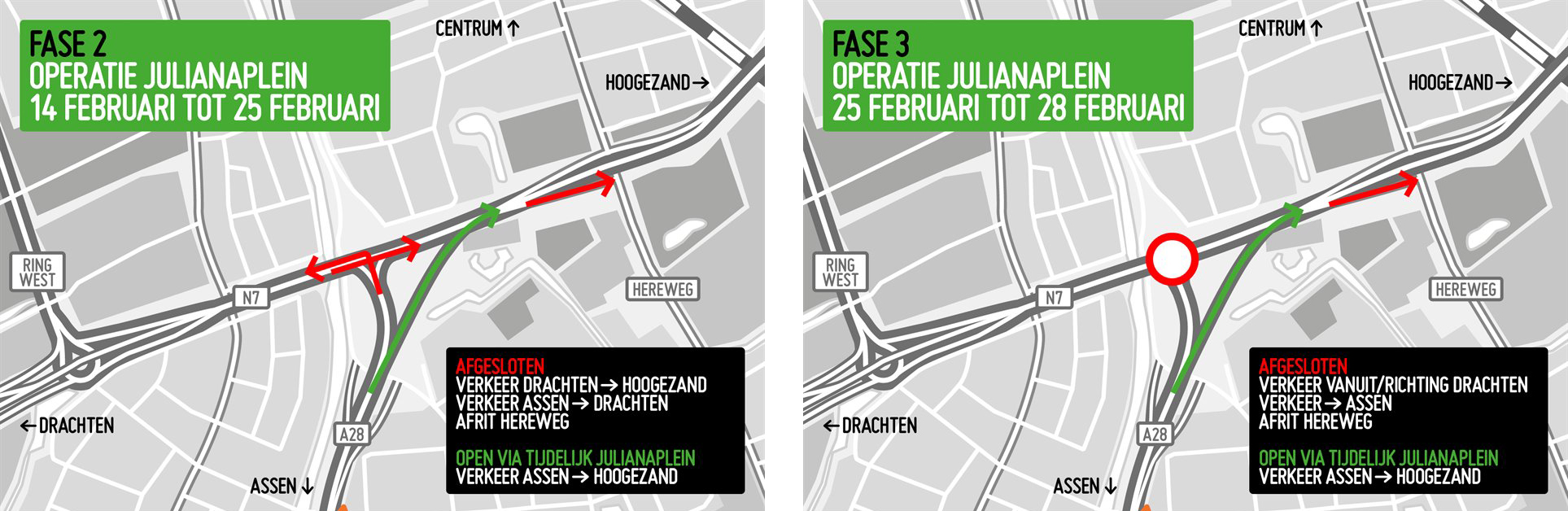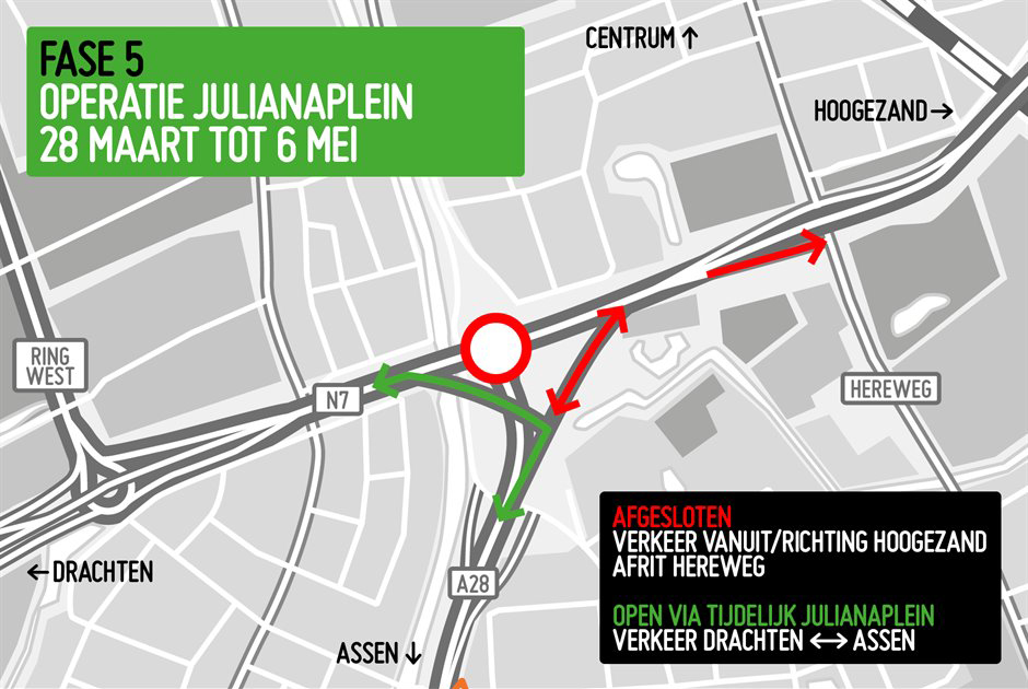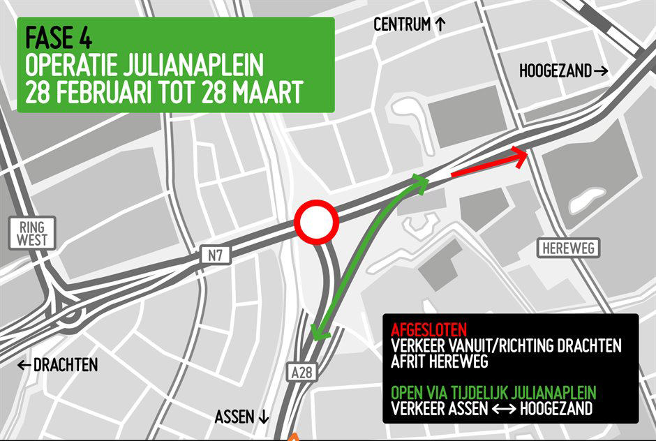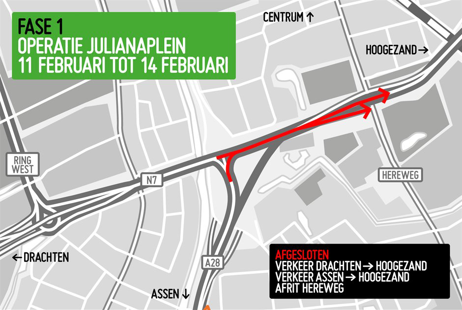 De eerste fases is er één van korte duur. In het eerste weekend (11 t/m 14 februari) wordt er gewerkt aan de rijbaan voor het verkeer dat van Assen richting Hoogezand gaat. Een groot deel van deze weg ligt er al, maar wordt tijdens deze periode aangesloten op de bestaande wegen. Het hele Julianaplein is dan afgesloten.