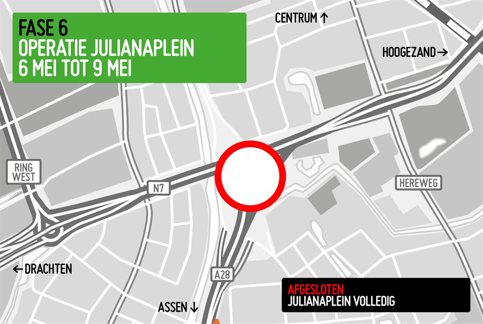 Het verkeer wat normaliter gebruik maakt van het Julianaplein, krijgt tijdens de dertien weken te maken met afsluitingen in zes verschillende fases. Elk van deze periodes brengt verschillende afsluitingen met zich mee. In het overzicht hieronder is te zien hoe de afsluitingen rond het Julianaplein verlopen tijdens de hele verbouwingsoperatie.