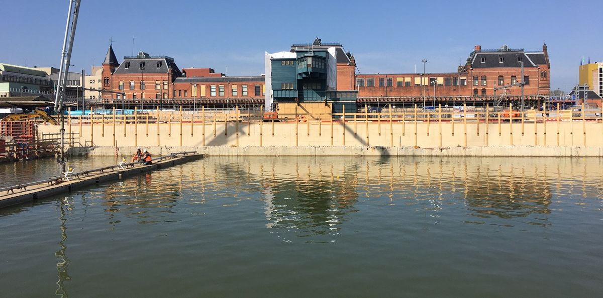 Dat bleek succesvol. Het onderwaterbeton zit in de bouwkuip, die nu nog op een groot zwembad lijkt. De komende weken moet het beton uitharden, waarna duikers een zogenaamd stempelraam in de kuip plaatsen. Dit raamwerk moet voor tegendruk op het beton zorgen. Als alles droog is, wordt de bouwkuip eind april droog gepompt.
