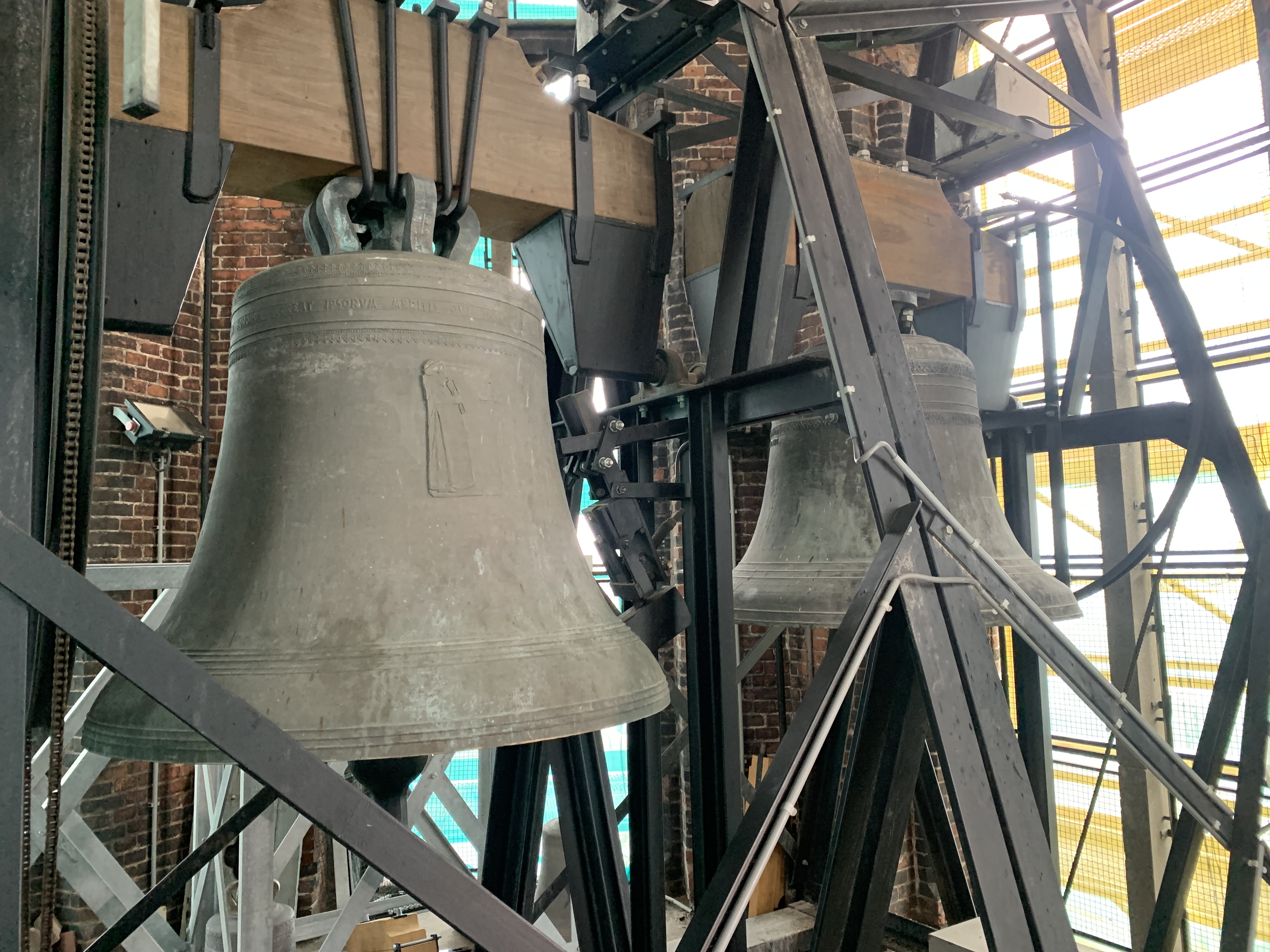 De kerk staat momenteel in de steigers, de klokken werden daarom met een bouwlift naar het topje van de kerk gebracht.