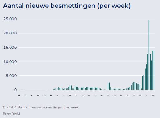 De meeste nieuwe besmettingen werden afgelopen week ontdekt in de gemeente Groningen. Daar ging het om 2.938 nieuwe gevallen per 100.000 inwoners. In de gemeente Eemsdelta ging het om 2.775 nieuwe gevallen, Het Hogeland 2.762, Westerkwartier 2.725 en Midden-Groningen 2.521.