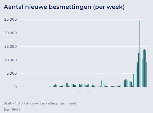 Het aantal besmettingen is sinds vorige week woensdag fors gedaald. “Afgelopen week zijn er 9.921 nieuwe besmettingen bijgekomen, een week eerder ging het nog om 16.316 nieuwe besmettingen. De besmettingsgraad ligt in onze regio op 1.691 nieuwe gevallen per 100.000 inwoners, dit ligt boven het landelijk gemiddelde van 1.272 per 100.000 inwoners. Het aantal ziekenhuisopnames is afgenomen tot 110,7 per 1.000.000 inwoners, dit was 151,6.” Sinds het begin van de coronapandemie zijn er in Groningen 237.723 personen positief getest.