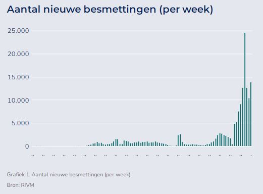 In de afgelopen week werden de meeste nieuwe besmettingen vastgesteld in de gemeente Groningen. Het gaat er om 3.423 nieuwe gevallen per 100.000 inwoners. In de gemeente Het Hogeland gaat het om 2.634 nieuwe gevallen, Westerkwartier 2.376, Eemsdelta 2.365 en Westerwolde 2.277.