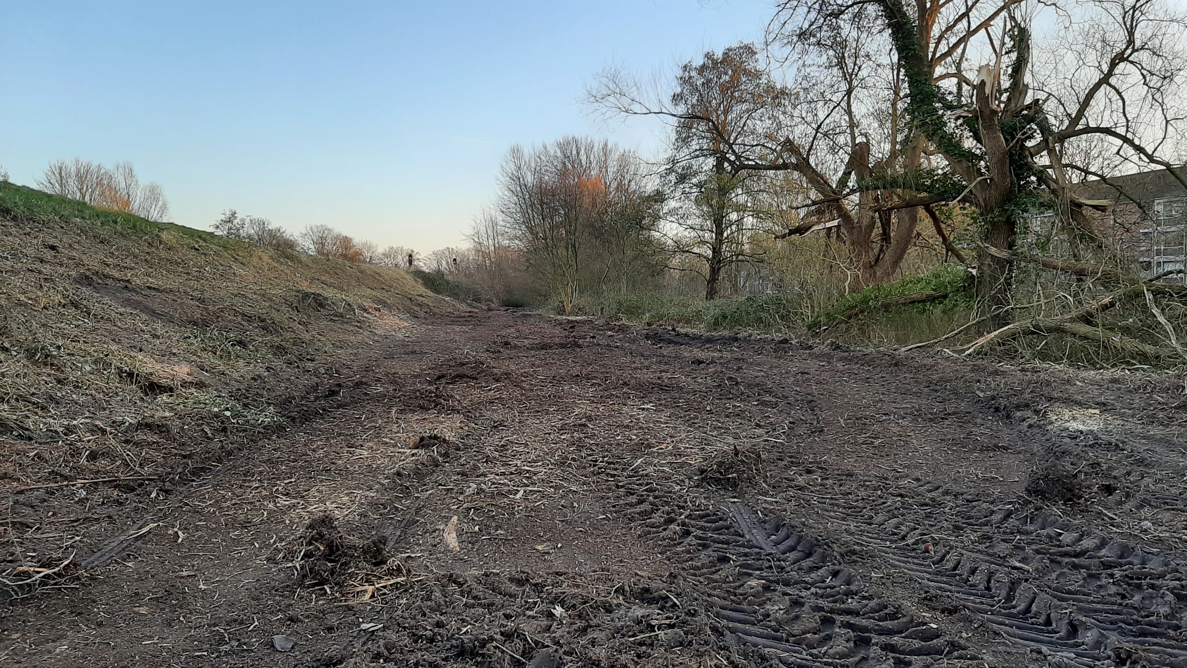 Een groenstrook langs het spoor in Selwerd is deze week gekapt. Er wordt een fietspad aangelegd.