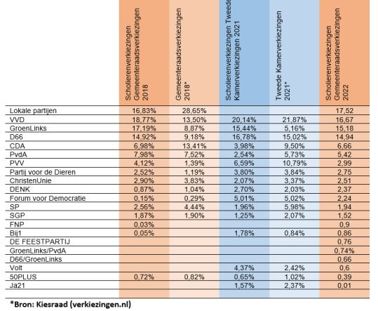 Als het aan scholieren in het voortgezet onderwijs en studenten in het mbo ligt, worden lokale partijen woensdag de grootste bij de gemeenteraadsverkiezingen. Het gaat om een landelijke peiling onder 22.663 scholieren.