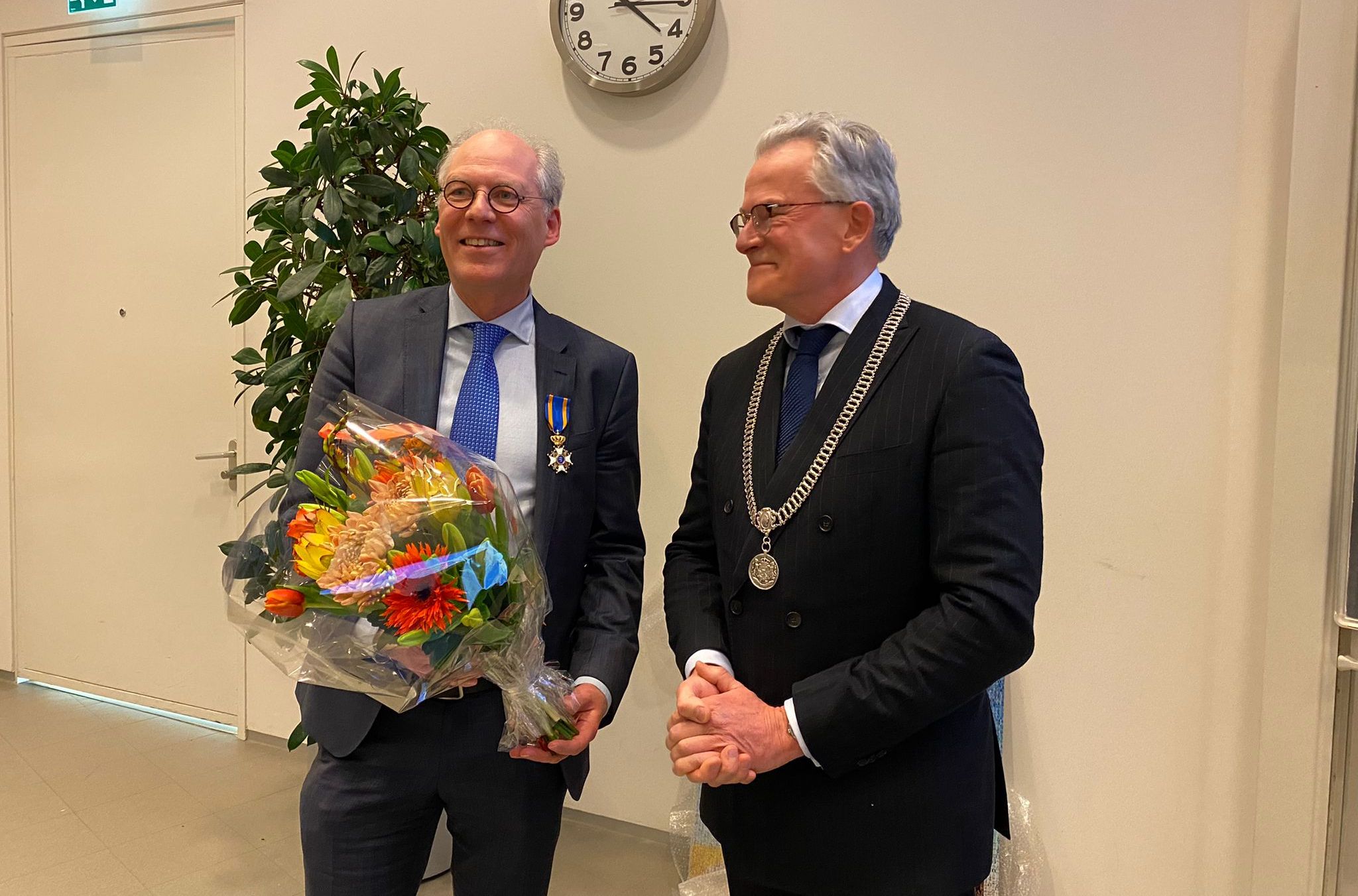 Tijdens zijn afscheid van de Rijksuniversiteit speldde burgemeester K.F. Schuiling van de gemeente Groningen hem de versierselen voor de onderscheiding van Ridder in de Orde van de Nederlandse Leeuw op. Knoester vertrok op 1 januari jongstleden naar de Universiteit Leiden, waar hij als decaan verbonden is aan de Faculteit Wiskunde en Natuurwetenschappen.
