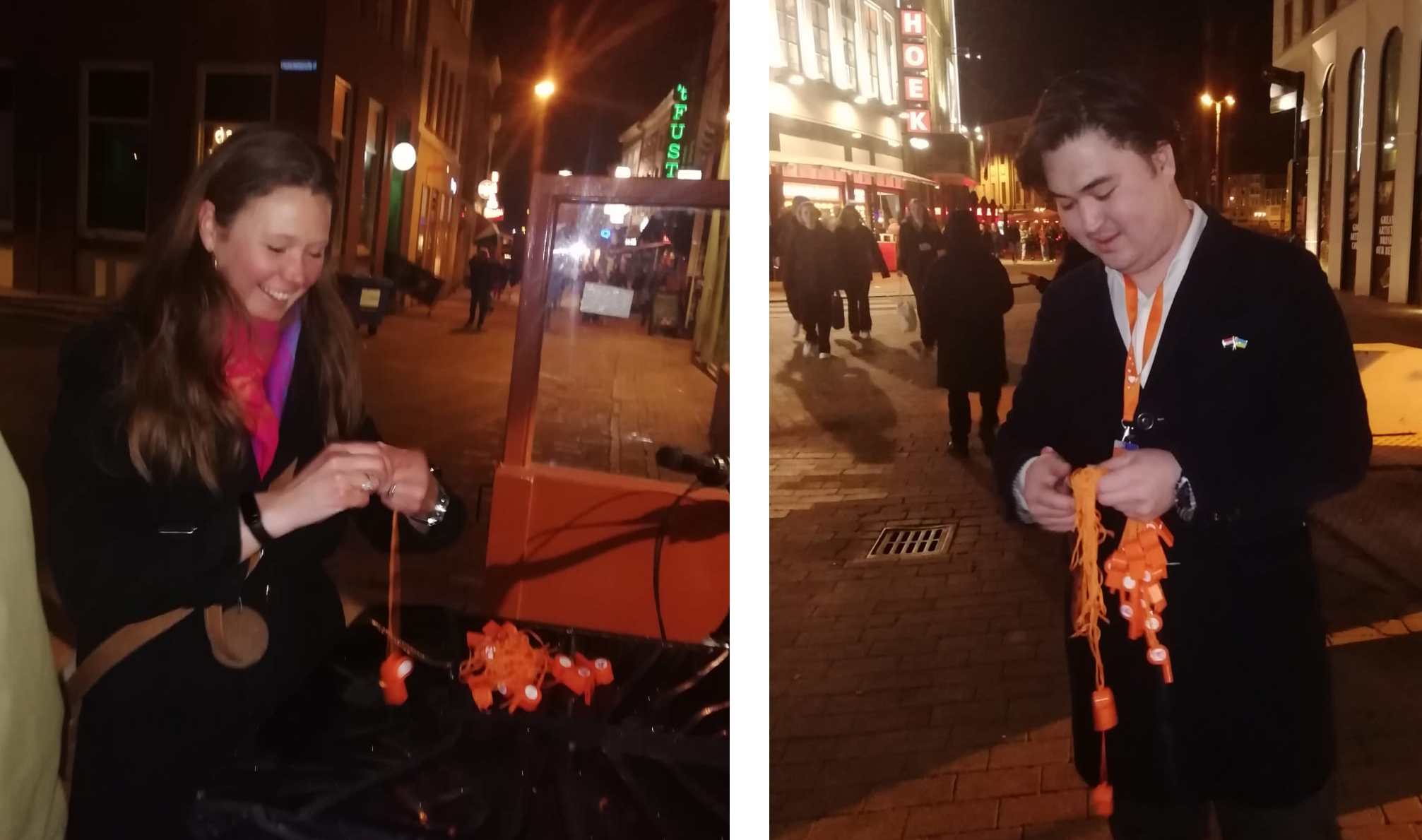 Oud-fractievoorzitter Sabine Koebrugge (links) en kandidaat-raadslid Yaram van Silfhout (rechts) halen een kluwen fluitjes uit elkaar om ze uit te kunnen delen – Foto’s: Paul Blom Yaram van Silfhout halen de kluwen fluitjes uit elkaar om ze uit te kunnen delen – Foto’s: Paul Blom