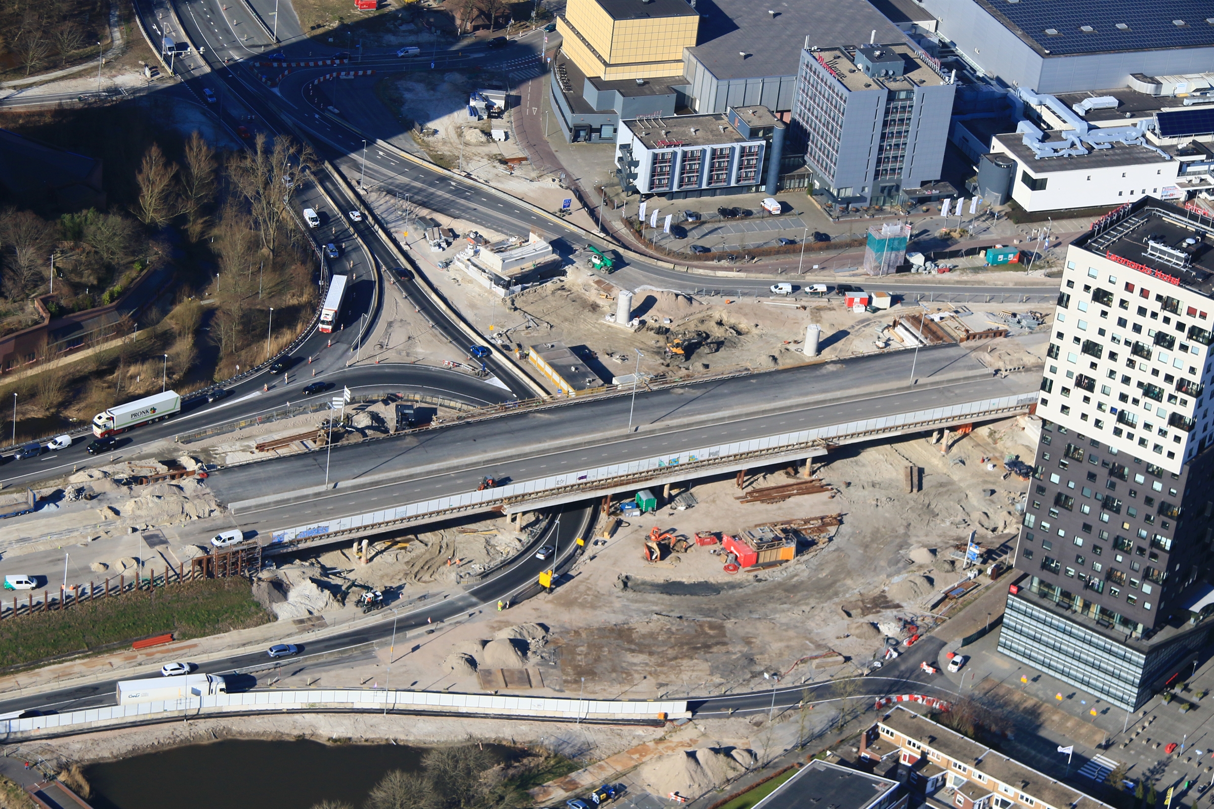 Aanpak Ring-Zuid deelde vrijdagmiddag luchtfoto’s van de verschillende bouwprojecten. De foto’s werden afgelopen dinsdag gemaakt door Rijkswaterstaat. De kruising die voorheen het Julianaplein was, lijkt compleet verdwenen onder zanderige heuvels en kuilen. Deze week verwijderde aannemerscombinatie Herepoort een groot deel van het asfalt van het verkeersknooppunt. Bij de A28 is ongeveer 9.000 kuub grond afgegraven.