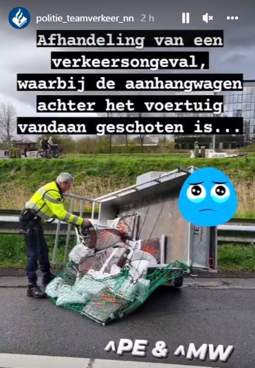 Het ongeluk gebeurde op de rijbaan van Stad richting Haren. Door nog onbekende oorzaak kwam de aanhangwagen los en belandde op de vluchtstrook tegen de vangrail. De lading kwam deels op de weg terecht. Bij het ongeluk raakte niemand gewond.