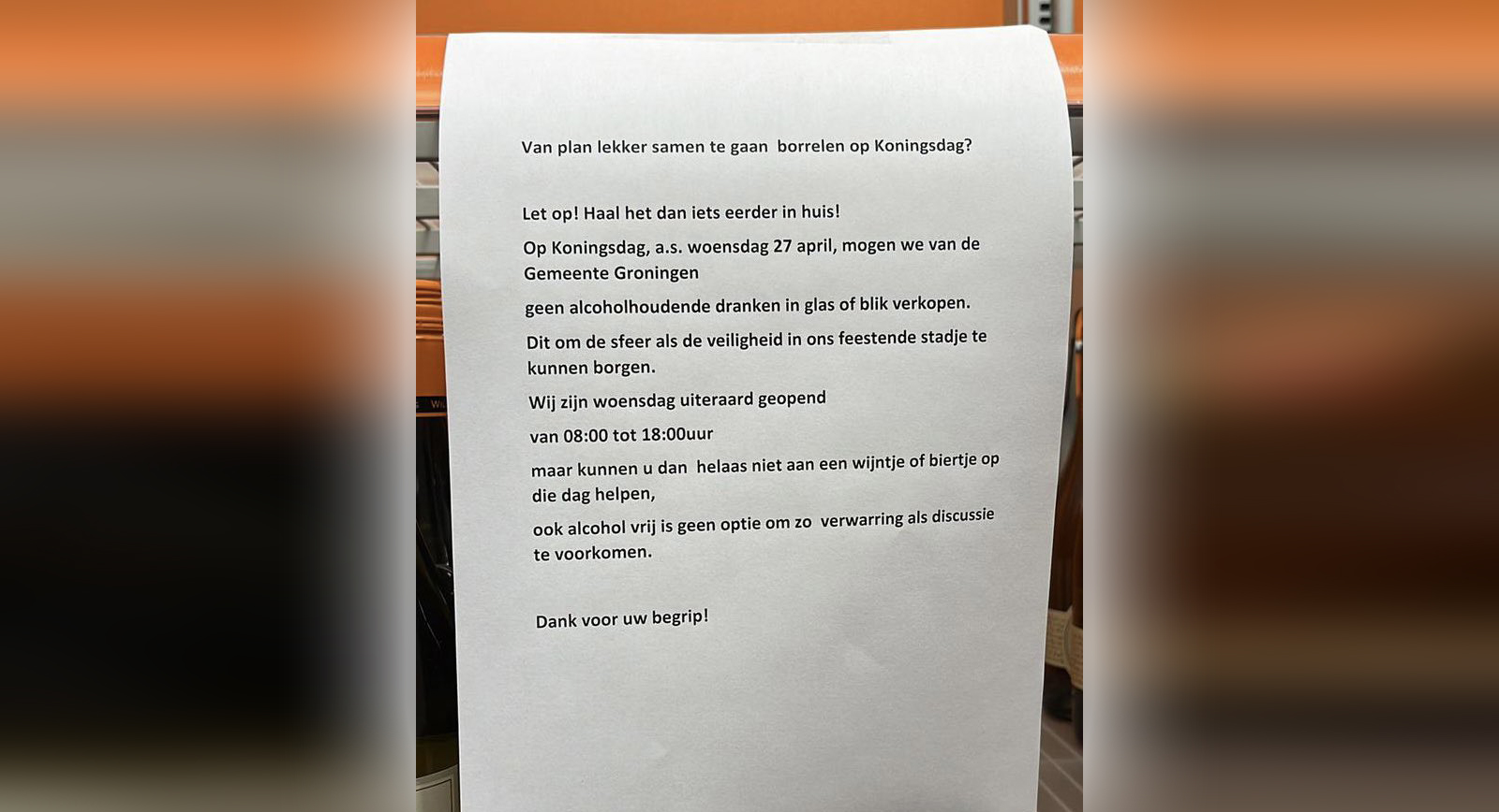 In Groningen mag je niks bij je hebben en niks verkopen in de supermarkten. (Iig geen alcohol in blik of glas dus drank in plastic flesje mag blijkbaar wel haha) pic.twitter.com/YEDds6BaO8