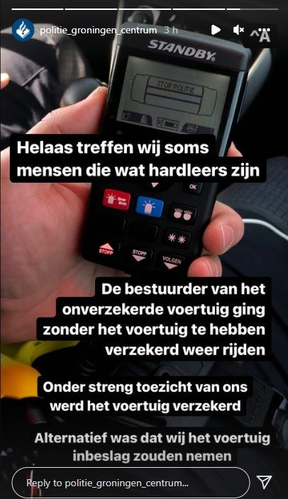 Korte tijd later troffen de agenten de auto opnieuw rijdend aan. “We hebben soms te maken met mensen die wat hardleers zijn. Het voertuig bleek nog steeds niet verzekerd te zijn. Onder streng toezicht van ons werd het voertuig verzekerd, waarbij het alternatief was dat we de auto in beslag zouden nemen.”