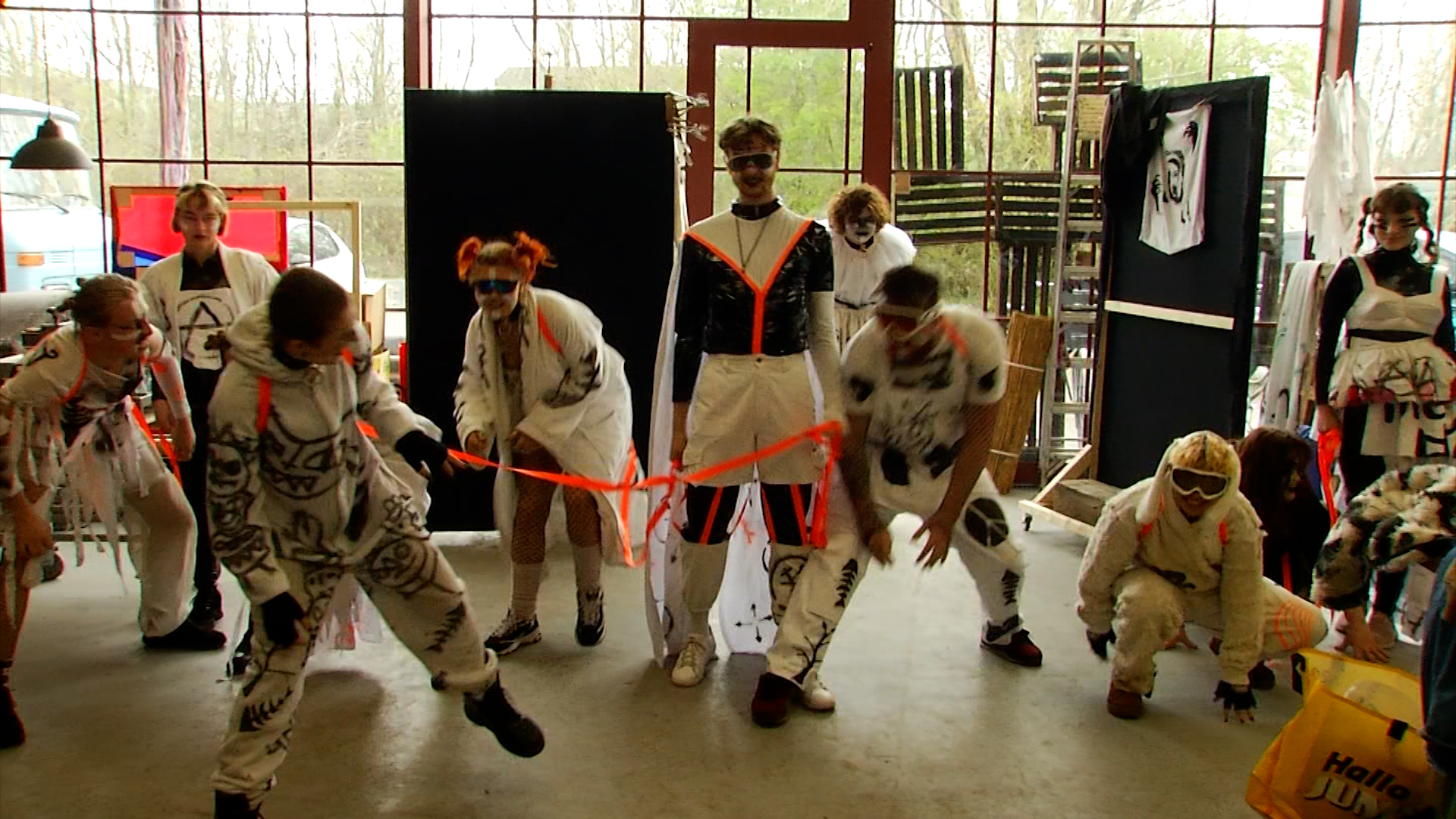 Op de muziek van Die Antwoord traden de studenten op in zelfgemaakte outfits. Volledig volgens het duurzame thema, want voor de creaties gebruikten ze overgebleven stoffen van eerdere projecten.