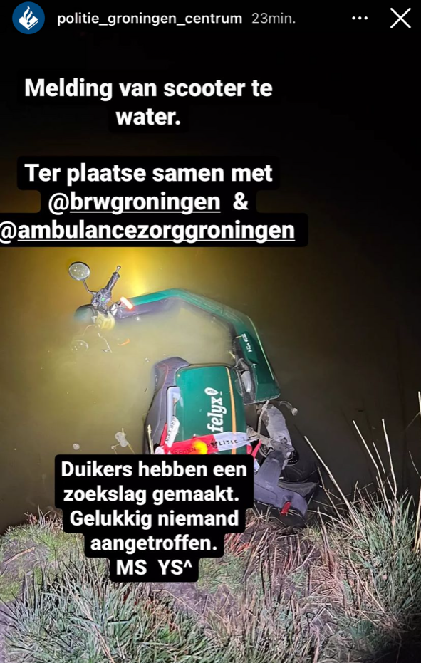 Bij de hulpdiensten was rond 23.30 uur een melding binnengekomen over een persoon te water. Daarop werden verschillende politiewagens, een ambulance, duikers en de grote hulpverleningswagen van de brandweer naar de locatie gestuurd. Bij aankomst troffen de hulpverleners een scooter aan die in het water lag. “Duikers zijn direct te water gegaan en hebben een zoekslag gemaakt in het water”, schrijft de politie.