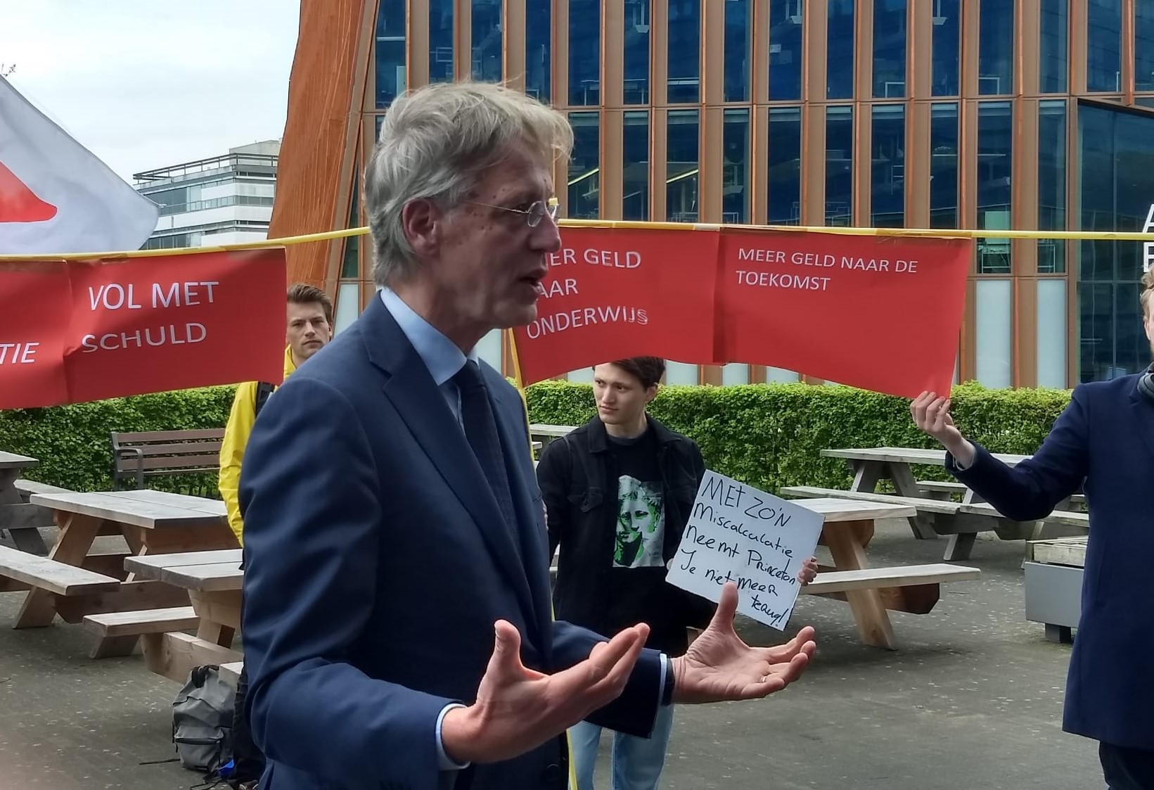 Dijkgraaf bezocht maandag verschillende onderwijsinstellingen in Groningen. Als laatste stond een bezoek aan de Hanzehogeschool op het programma. “Wij hadden ons buiten verzameld”, vertelt Marinus Jongman van #nietmijnschuld. “Een volledige verrassingsactie was het niet. De minister heeft verschillende mensen om zich heen, en omdat we best wel zichtbaar waren, was Dijkgraaf van tevoren geïnformeerd. Hij is het gesprek met ons aangegaan, maar wilde uiteindelijk niet een keuze maken. Ja, dat vind ik wel flauw want zo moeilijk is die keuze niet. Maar hij wilde het niet.”