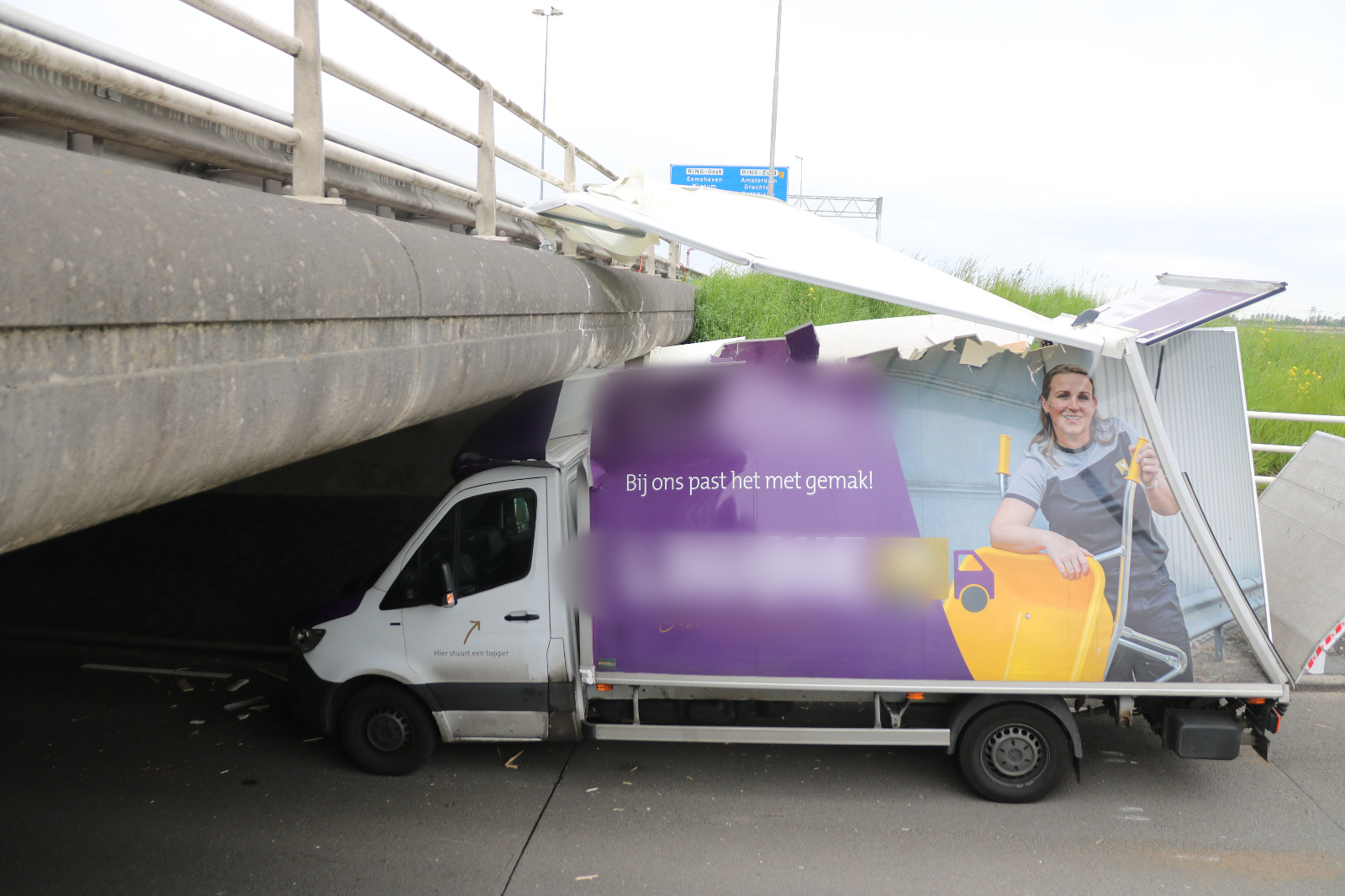 Met een slogan als ‘Bij ons past het met gemak’ moet de bestuurder van een bedrijfswagen hebben gedacht dat hij een viaduct bij de Olgerweg met gemak kon passeren. Maar niet bleek minder waar, zo bleek dinsdagmiddag.