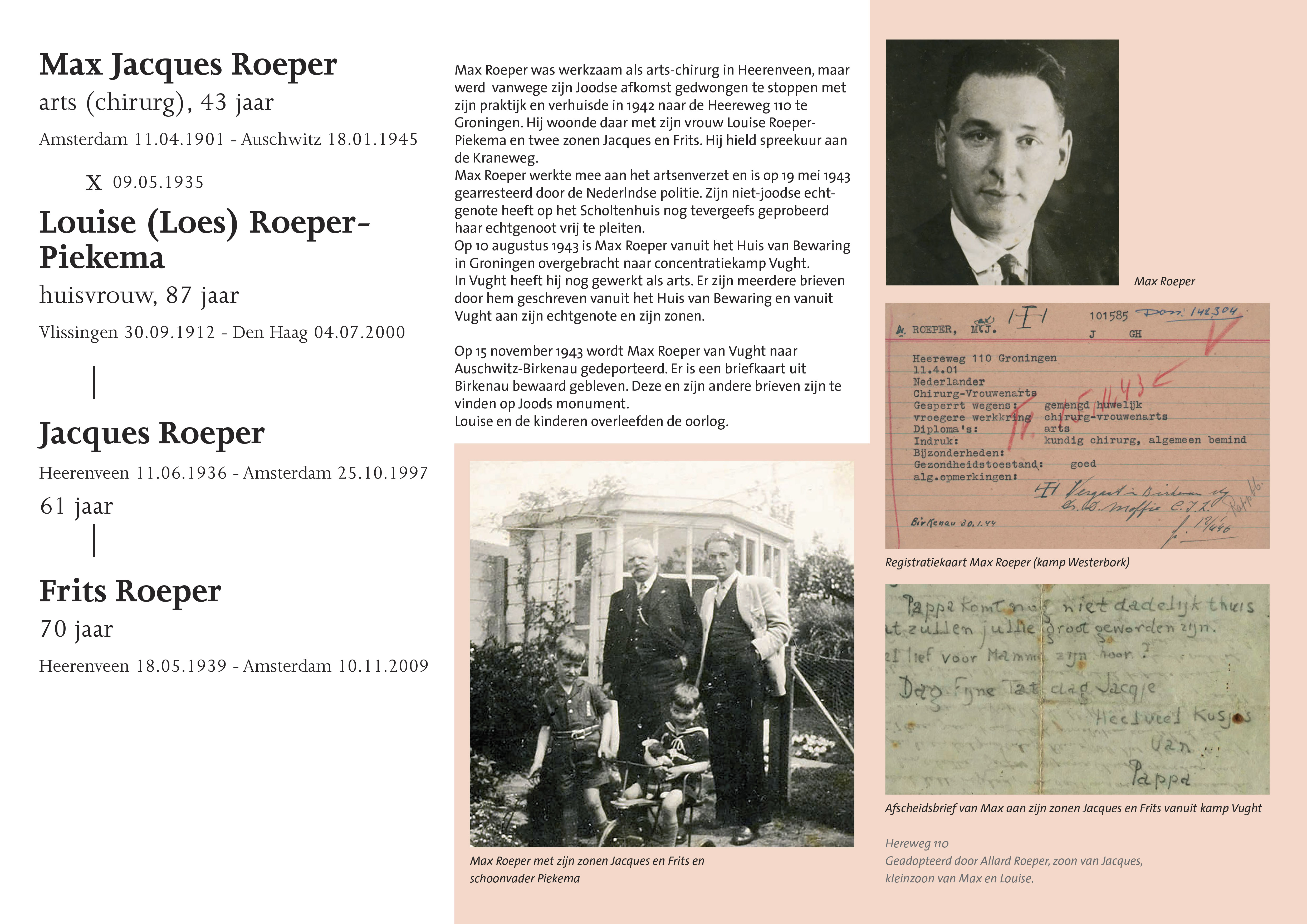 De zuiltjes zijn geplaatst op een over de gehele vloer van de synagoge uitgelegde plattegrond van de wijk. Bezoekers kunnen op die manier door de straten, langs de voormalige adressen van vermoorde bewoners, wandelen en zich verdiepen in hun verhalen. Bij de expositie wordt ook een familiefilm getoond die vlak voor de Tweede Wereldoorlog werd gemaakt door de Joodse arts Max Roeper. Hij en zijn vrouw Loes Piekema vestigden zich in 1941 met hun kinderen aan de Hereweg 110 in Groningen. Hoewel de Duitsers Joodse artsen inmiddels hadden verboden hun vak uit te oefenen, werkte Max door. Hij werd echter verraden door een NSB-patiënt. Op 10 augustus 1943 werd Max gearresteerd en gevangen gezet in het Huis van Bewaring in Groningen. In januari 1945 stierf Max Roeper in Birkenau aan de gevolgen van vlektyfus.