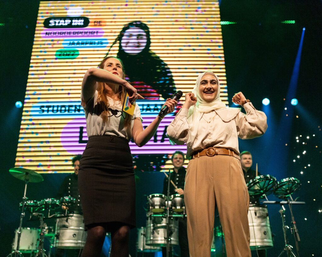 Studente Lava Haji heeft dinsdag in MartiniPlaza de Noorderpoort Jaarprijs 2022 gewonnen. Het bedrijf Promotex werd uitgeroepen tot het leerbedrijf van het jaar.