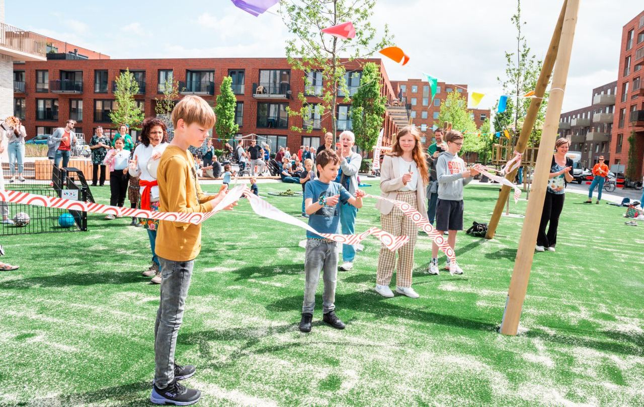 Buurtbewoners verzamelden zich zaterdagmiddag rond de speeltuin voor ijs, koffie, poffertjes, smoothies en live muziek. Dat zorgde voor gezellige drukte en een goede sfeer. Een aantal kinderen uit de buurt mocht zelf het openingslint voor de speeltuin doorknippen, omdat ze mee hebben geholpen bij het ontwerp van hun nieuwe speelplek.