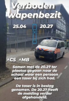 De persoon bleek een taser bij zich te hebben. “Samen met een collega ter plaatse gegaan waarbij we het wapen in beslag hebben genomen”, schrijft de politie. De gegevens van de persoon zijn genoteerd en er wordt verder onderzoek verricht.