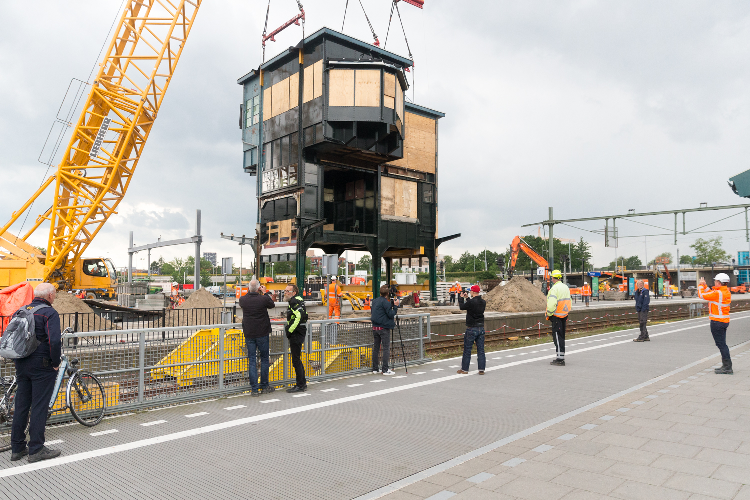 De meest spectaculaire operatie vond woensdagavond en donderdagochtend plaats. Toen gingen het 94 jaar oude, monumentale seinhuis en de bijbehorende passerelle de lucht in voor een verhuizing naar een ‘parkeerplaats’ op perron 3. In de onderstaande timelapse is te zien hoe de twee bouwwerken, die gezamenlijk ruim 200 wegen, een nieuwe plek kregen.