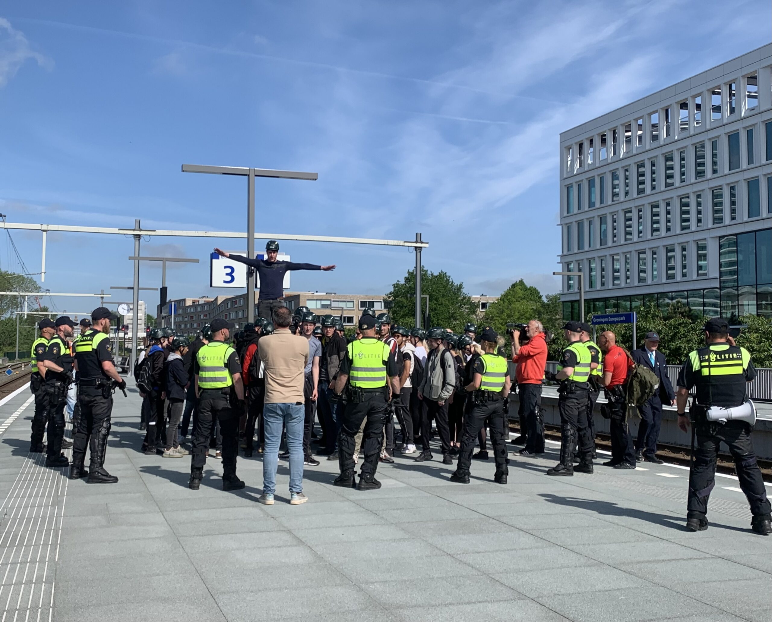 Het ‘rellen’ begon voor de studenten op station Europapark, hier stapten ze uit de trein en werden ze door de agenten naar een bus toegeleid. De tocht was niet erg rustig: “Het rellen gaat er hard aan toe, we maken veel lawaai en er is zelfs een raam in de bus kapot gegaan”, vertelt één van de ‘relschoppers’.