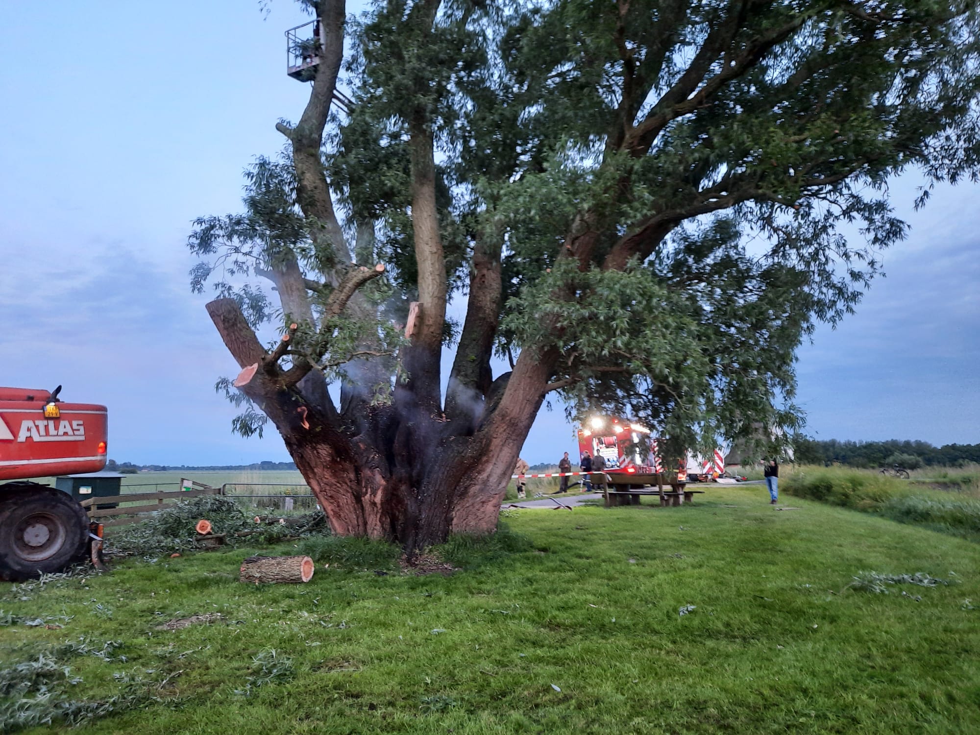 De melding van de brand kwam rond 18.50 uur bij de brandweer binnen die daarop een tankautospuit ter plaatse stuurde. “De gemeente Groningen en wij als Natuurmonumenten zijn ook ter plaatse”, vertelt boswachter Bart Zwiers. “De schade is zo groot dat we de boom terug gaan snoeien waarmee we hopelijk de stam kunnen behouden. De brandweer koelt de boom om de tien minuten, waarbij we zien dat het vuur aan het doorsmeulen is in de stam. Door de boom terug te snoeien hopen we dat de stam mogelijk in de toekomst weer uit kan lopen.”