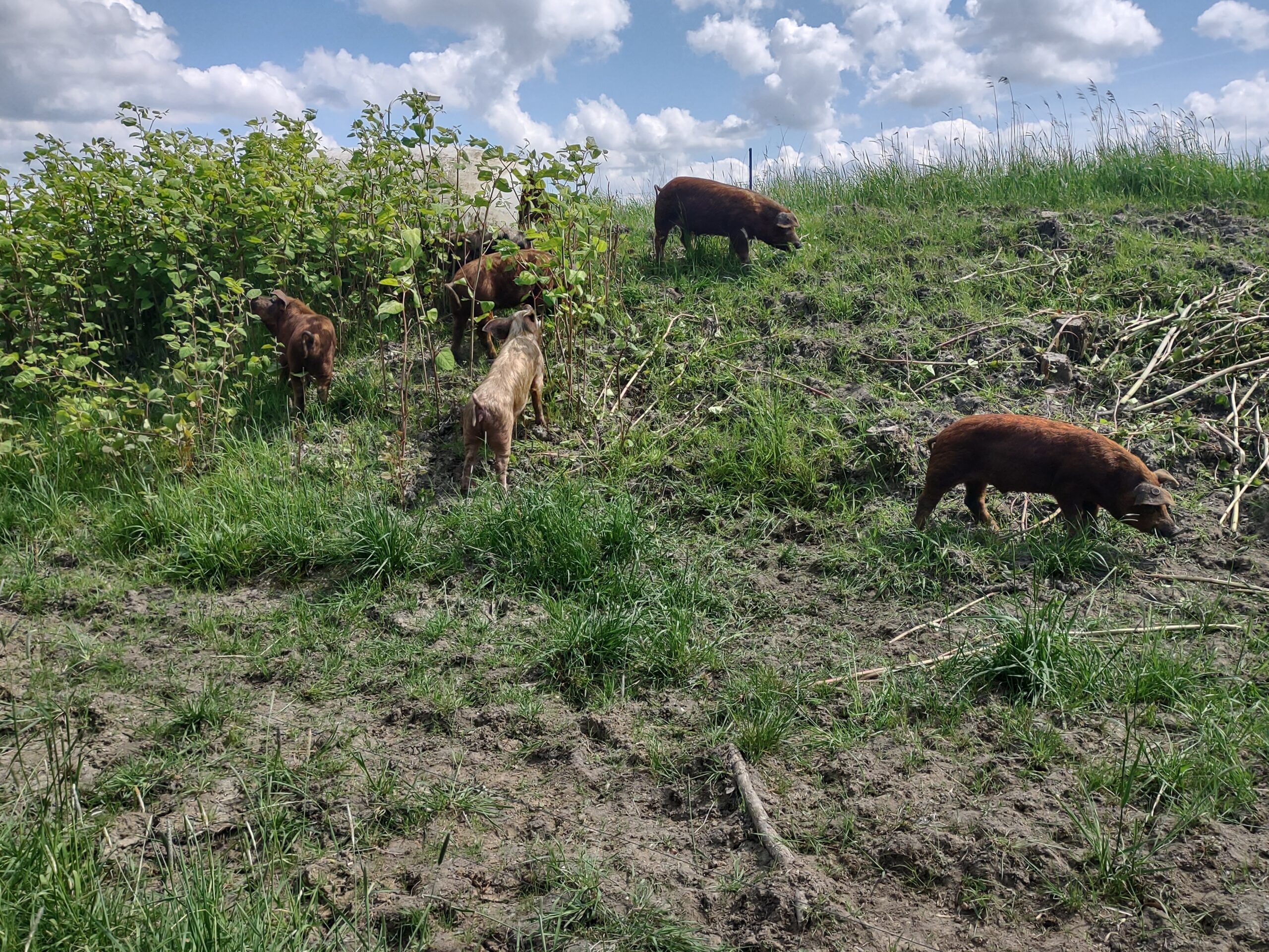 Ook op 22 andere plekken lopen varkens om invasieve planten als de Berenklauw en de Japanse Duizendknoop tegen te gaan. Op het dijkje staan momenteel zeven varkens te wroeten. Normaal gesproken lopen de varkens van maart tot november rond om de Japanse Duizendknoop tegen te gaan.