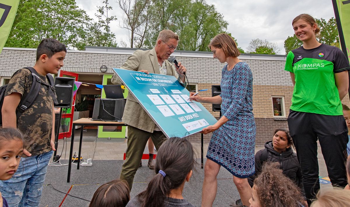 Op basisschool Het Kompas in Lewenborg zette directeur Marjolein Wildeboer maandagmiddag haar handtekening op een groot bord van de Verlengde Schooldag. Daarmee gingen de activiteiten voor het ontwikkelingsprogramma officieel van start in Beijum en Lewenborg.