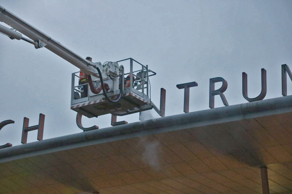 De brandweer kwam met drie voertuigen ter plaatse, waaronder een hoogwerker. De busbaan moest enige tijd worden afgesloten, zodat brandweerlieden via de hoogwerker bij de neonletter konden komen.