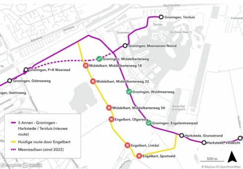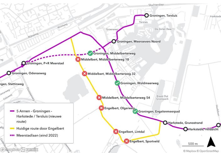 Het OV-bureau Groningen-Drenthe laat in het ontwerp hoofdlijnen 2023 weten dat de route naar Harkstede wordt aangepast. Er wordt niet meer via Engelbert en Middelbert gereden, maar via de Hoofdweg. Wanneer de route wordt aangepast is nog onbekend, omdat eerst een vervangende halte aan de Middelberterweg klaar moet zijn. Ook wil men de resultaten van een participatieproces afwachten. Het aanpassen van de lijn levert een besparing op van 125.000 euro. Men schrijft verder: “Er zijn klachten van zowel chauffeurs als omwonenden over de huidige route van Q-link 5 door Middelbert en Engelbert. De dorpskernen zijn niet goed geschikt voor grote bussen.”