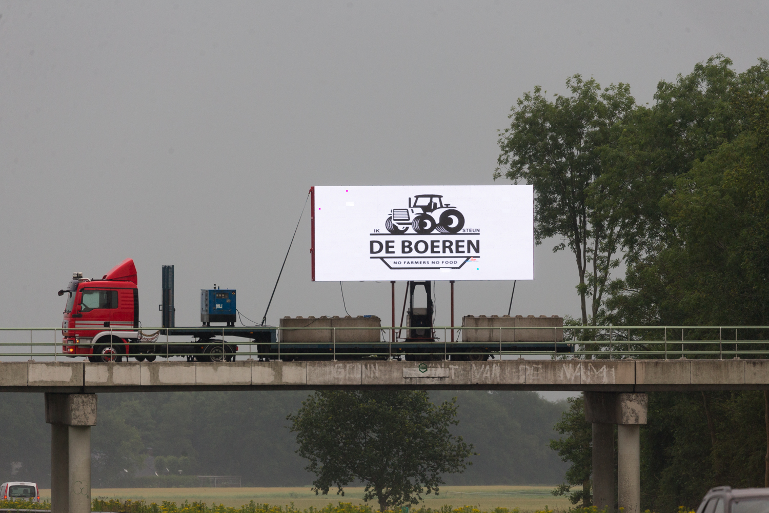 De vrachtwagen staat geparkeerd op het viaduct Engelberterweg. Verkeer op de A7 dat richting Stad rijdt krijgt de boodschappen op het scherm te zien. Op het scherm is onder andere de slogan ‘Hou je van brood, vlees of friet, zonder boeren gaat het niet’ te lezen. Ook is de tekst ‘D66 interesseert het geen zak’ te zien. Fotograaf Rieks Oijnhausen meldt dat nabij het viaduct, op een parallelweg, trekkers in de berm staan geparkeerd.