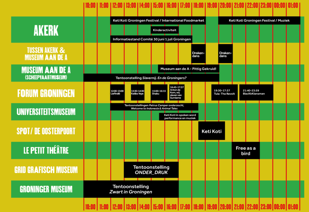 Het programma van het Keti Koti Festival duurt de hele dag. Om 09.00 gaan het Museum aan de A en het Groninger Museum open, waar de tentoonstellingen ‘Slavernij en de Groningers en ‘Zwart in Groningen te zien zijn. Op 1 juli zijn alle Bitterzoet Erfgoed-tentoonstellingen in de stad gratis te bezoeken: in de Akerk, het GRID Grafisch Museum, Groninger Museum, Museum aan de A en in het Universiteitsmuseum.