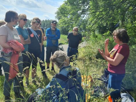 “Vier keer in het jaar organiseren we een stadsnatuurwandeling”, vertelt Hilly Kreuzen, die de wandeling samen met Adri Akkerman organiseerde. “Vandaag hebben we gekozen voor een iets andere opzet. We wilden iets met water doen, ook in het kader van slootjesdag, dat dit weekend plaatsvindt. Daarom zijn we op de fiets naar de Hunzezone gegaan. Daarmee hebben we wel gebroken met de traditie om ons op de Oosterparkwijk te richten. Het weer was voortreffelijk, en er waren rond de twintig mensen op de ‘wandeling’ afgekomen, van jong tot oud. Daar zijn we super blij mee. Op de fiets was het ook een lang lint. Er heerste het gevoel alsof we op schoolreisje gingen, haha.”