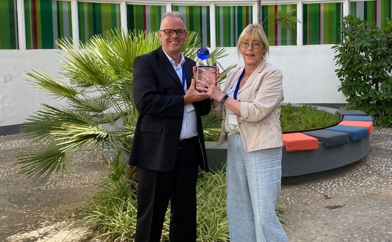 Marie-Anne de Groot (PI Veenhuizen) en Eric Blaauw (Hanzehogeschool Groningen) met de eerste Europris Prison Achievement Award 2022. Foto: Hanzehogeschool