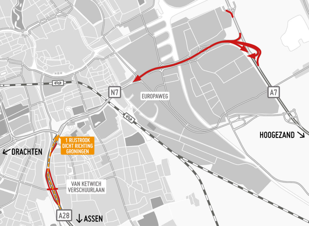 De noordbaan, voor het verkeer richting Europaplein, is dicht van vrijdag 8 juli tot maandag 29 augustus. De zuidbaan, voor verkeer richting Hoogezand, is dicht van maandag 11 juli tot vrijdag 26 augustus. Het verkeer wordt omgeleid via de overige ringwegen. Tijdens deze zeven weken wordt onder meer gewerkt aan het viaduct over de Europaweg, een nieuwe afrit vanaf de ringweg richting Europaweg, en wordt nieuw asfalt gelegd.