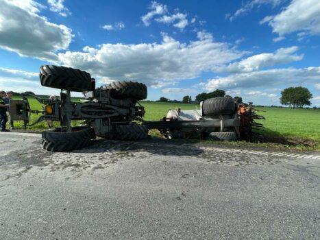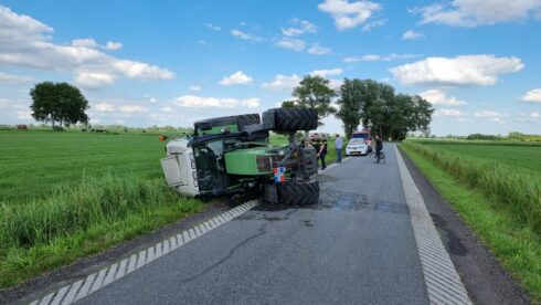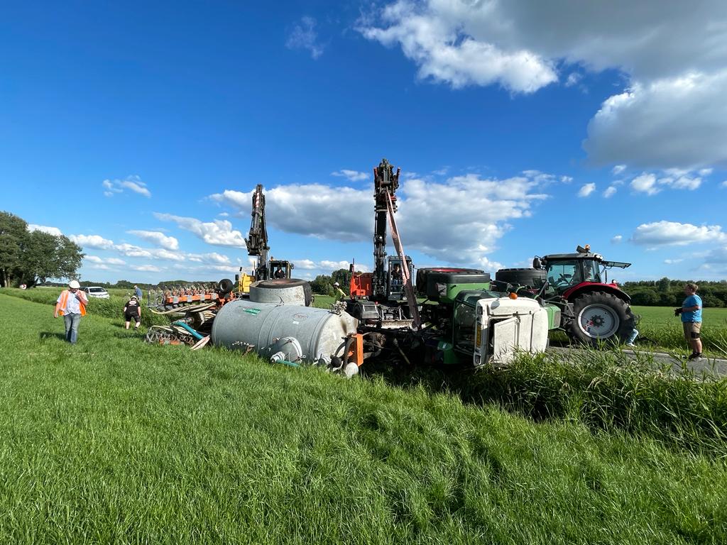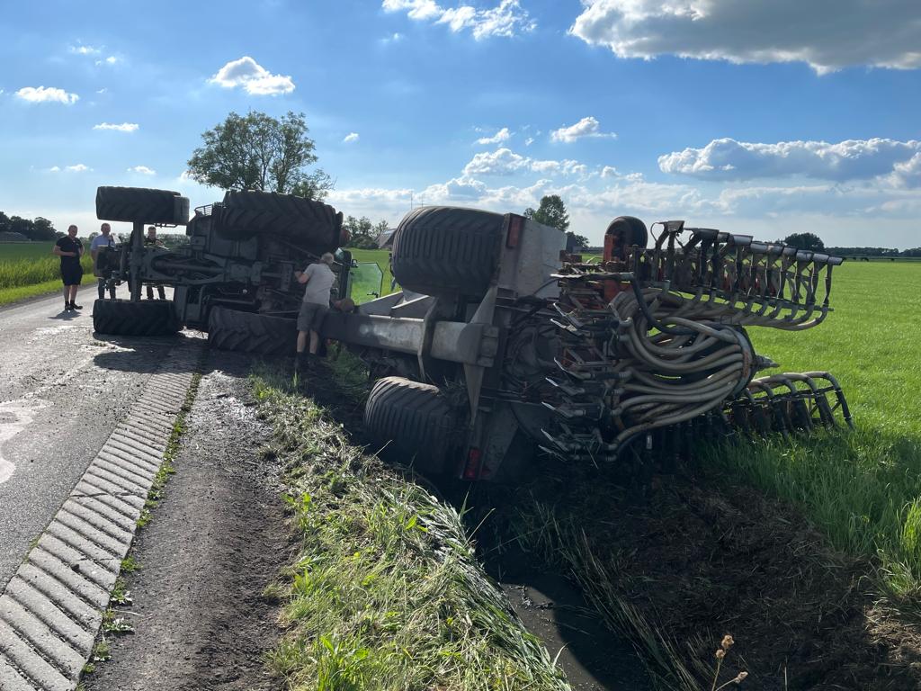Het ongeluk gebeurde rond 17.50 uur. De trekker met mest injector reed over de weg toen het uit moest wijken voor een tegenligger. Door de waarschijnlijk drassige ondergrond zakte de combinatie weg en kwam het op zijn kant terecht. De mest injector belandde daarbij in een parallel lopende sloot. De bestuurder van de trekker kon op eigen kracht uit het voertuig klimmen. De persoon is nagekeken door ambulancepersoneel, maar hoefde niet mee naar het ziekenhuis.