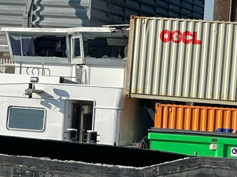 Bij de aanvaring verschoven containers, waarbij één van de containers tegen de stuurhut kwam waarbij verschillende ramen sneuvelden. Foto: Rieks Oijnhausen