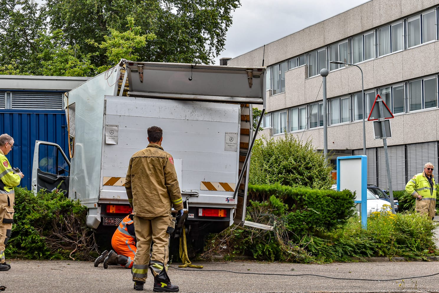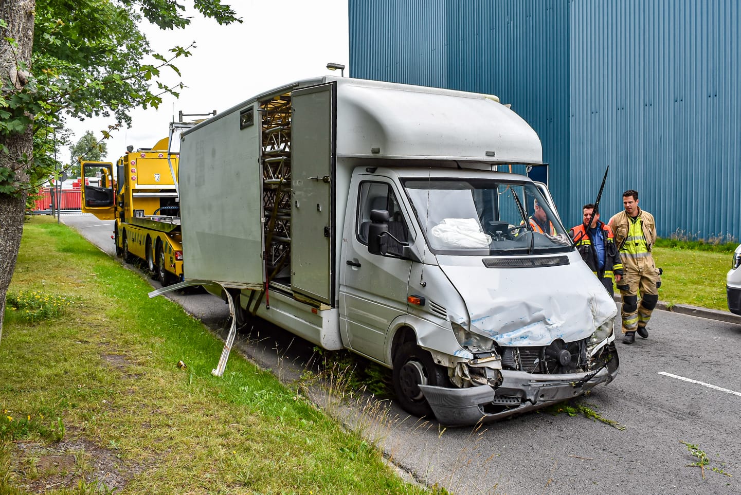 Uiteindelijk raakte de persoon niet gewond. “De bestuurder is wel even gecontroleerd in de ambulance, maar hoefde niet mee naar het ziekenhuis.” De politie doet onderzoek naar de precieze toedracht. De bestelbus is geborgen door een bergingsbedrijf. Volgens nieuwsfotograaf Mike Weening van Weening Fotografie is het busje zwaar beschadigd geraakt. “Het busje was geladen met steigeronderdelen voor festivals waar lampen aan kunnen hangen.”