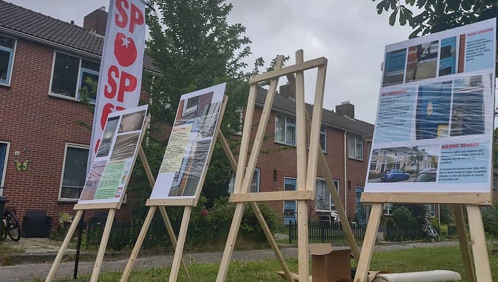 Deze woningen krijgen van hun woningcorporatie wel een geïsoleerd dak en zonnepanelen. Maar de bewoners willen dat ook de rotte kozijnen en de deuren, het staande water onder de woningen en de schimmel worden aangepakt. Die eisen stonden tijdens de tentoonstelling afgebeeld op schildersezels.