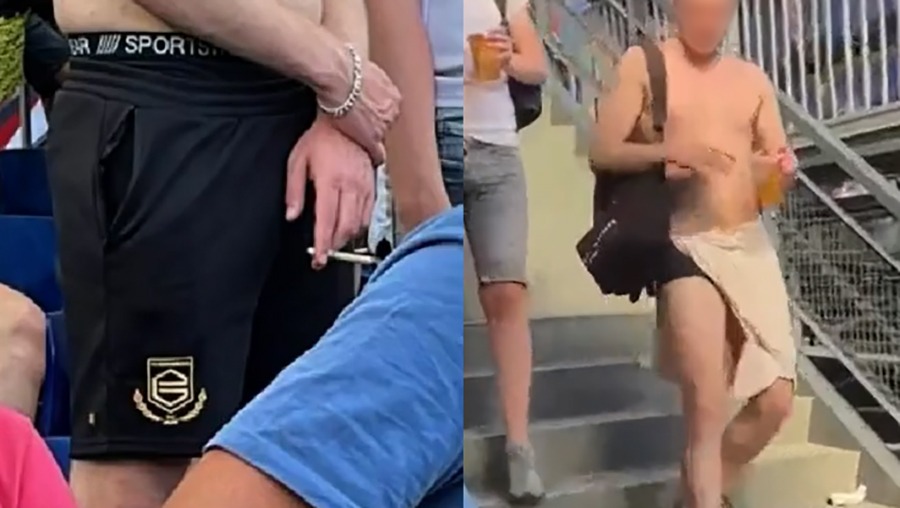 Op de beelden is ook te zien hoe de man een flinke zet krijgt en daarna in zijn boxershort op de tribune plaats neemt.