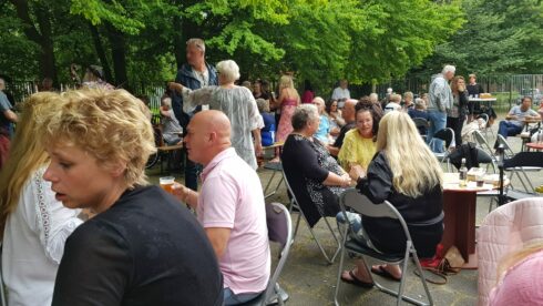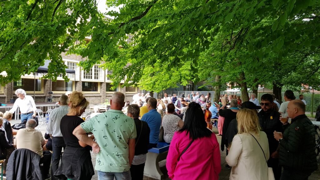 Dat het laagdrempelig is wordt zaterdag duidelijk door middel van een open dag. “We doen dat op de Oosterpark-manier. We verkopen eigen gemaakte broodjes gehaktbal en broodjes hamburger, we hebben een podium waar levensliederen gezongen worden door artiesten als Johnny Bach en El Jackson, en uiteraard mag de biertap ook niet ontbreken. Of het al een beetje druk is? We zijn rond 16.00 uur van start gegaan, en ik schat dat er nu wel een mannetje of vijftig hier staan. Het oogt heel gezellig en we hebben ook heel veel geluk met het weer. We zijn nog tot 20.00 uur geopend, dus iedereen is ook nog welkom.”