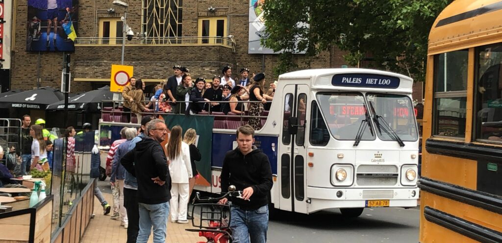Wandelend en rijdend in (oude) bussen trok een stoet studenten van Albertus Magnus vrijdagmiddag door de Groninger binnenstad richting de Grote Markt.