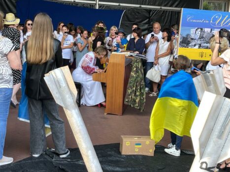 “Er zijn hier ruim honderd mensen aanwezig”, laat een nieuwsfotograaf weten. “Er worden toespraken gehouden, er is muziek en de Oekraïense vlag is veelvuldig aanwezig. Maar wat misschien wel de meeste indruk maakt is het beeld van ingeslagen kruisrakketten op de Grote Markt. Ze hebben hier een stellage geplaatst waardoor het lijkt alsof er zes rakketten zijn ingeslagen. Op de raketten staan teksten geschreven.”