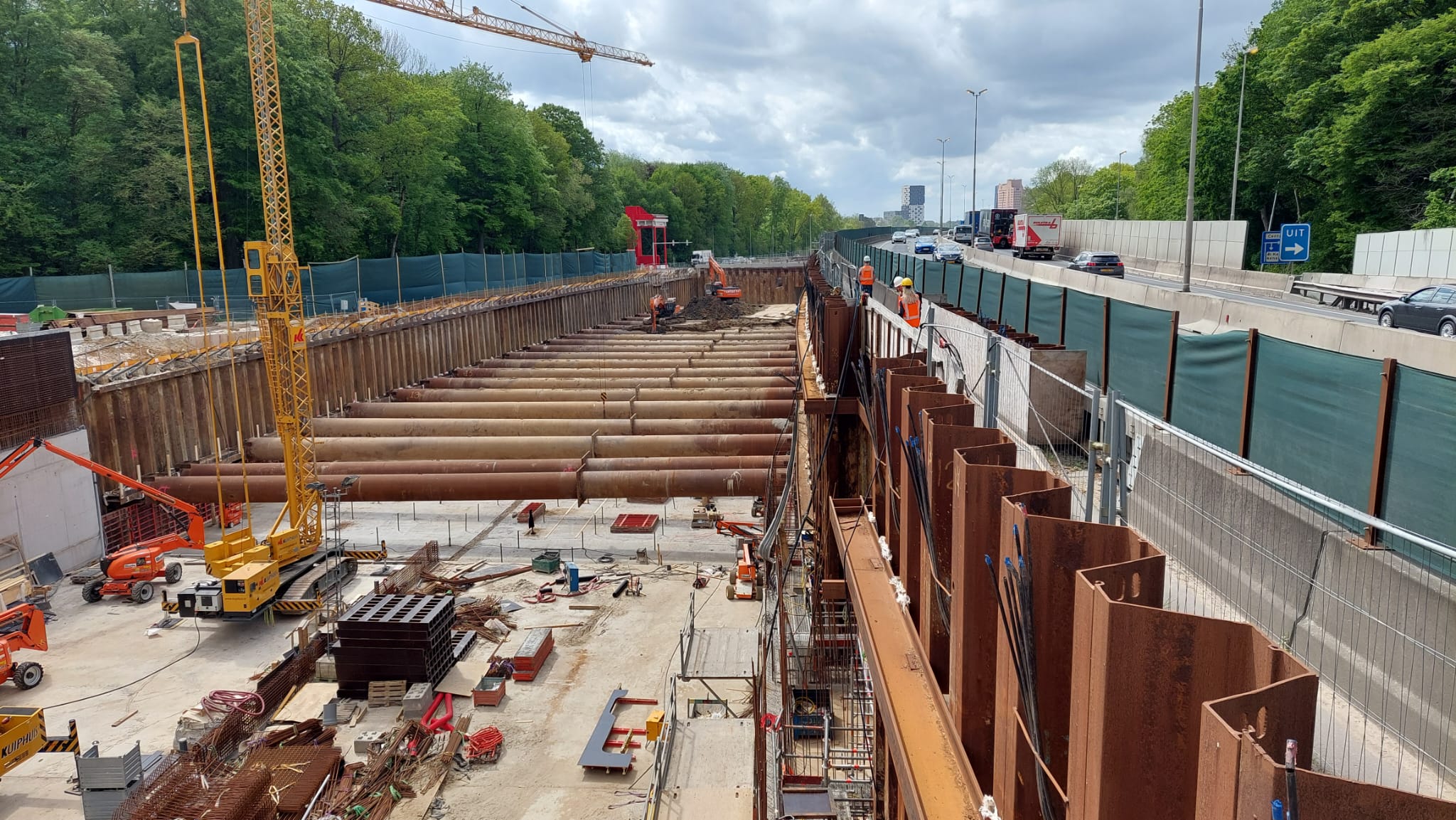 Zo is op de kaart van 1 augustus te zien dat ‘moot 4’ (tussen het Europaplein en de Kempkensberg) nu de meeste voortgang is geboekt. Daar liggen zowel de zijwanden, de wanden als de ‘deksels’ klaar. In ‘moot’ 5 en 6 liggen de vloeren erin en zijn al een aantal zijwanden gestort. In ‘moot 2’ ligt de vloer klaar en in moot 1, 2 en 7 moet het betonstorten nog beginnen.
