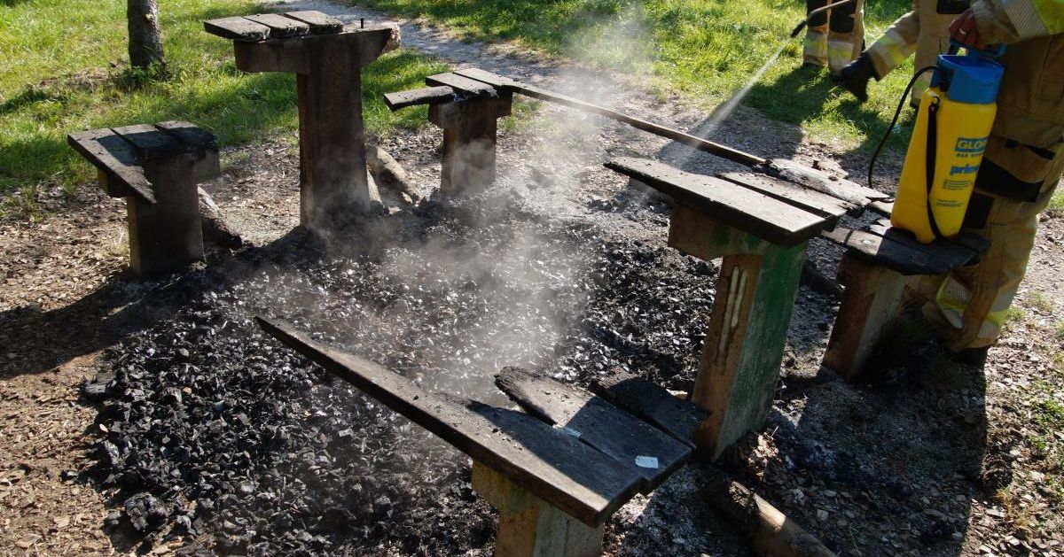 Het nasmeulende tafelbankje werd dinsdagochtend pas ontdekt. De brandweer restte dan ook niks anders meer dan af- en nablussen.