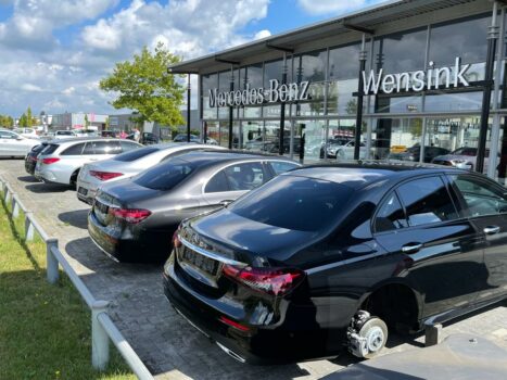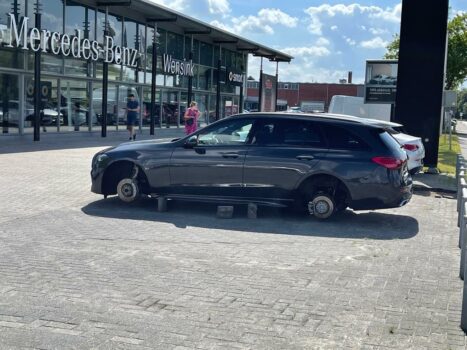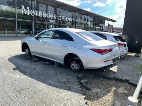 Een nieuwsfotograaf vertelt dat ongeveer tien gloednieuwe Mercedes-wagens op bakstenen zijn geplaatst. De bakstenen zijn afkomstig van het terrein. De wielen en de velgen ontbreken. Volgens stadsblog Sikkom is de diefstal opgemerkt door een voorbijganger. Deze heeft ook de politie geïnformeerd over de diefstal.