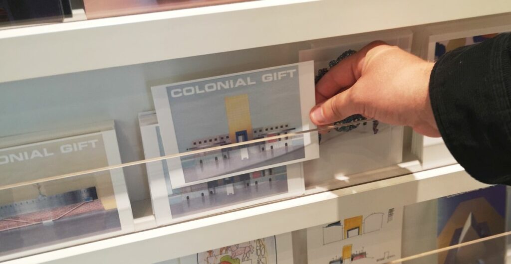 Op de achterkant van de kaarten, met op de voorkant de tekst ‘colonial gift’, stond een QR-code naar de website van de actiegroep met een begeleidend artikel. Daarop staat te lezen dat de activisten het museumgebouw beschouwen als een koloniaal geschenk, omdat het museum zich zou laten sponsoren door de fossiele industrie (GasUnie en GasTerra).